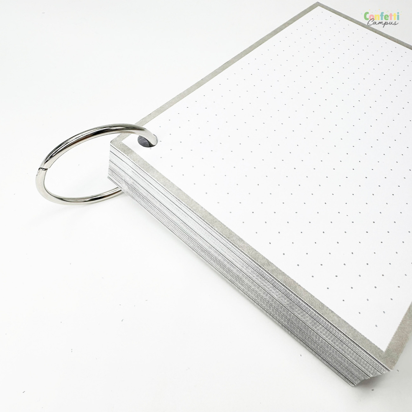 Optioneel: De A6 dotted flashcards kunnen geperforeerd worden. Dan boren we een gaatje linksbovenin de kaarten. Combineer dit met een handige klikring en houd de kaarten eenvoudig bij elkaar. Bundel ze per onderwerp, examen of vak. Je kunt ze ook in je tas stoppen en de flashcards meenemen om onderweg te studeren.