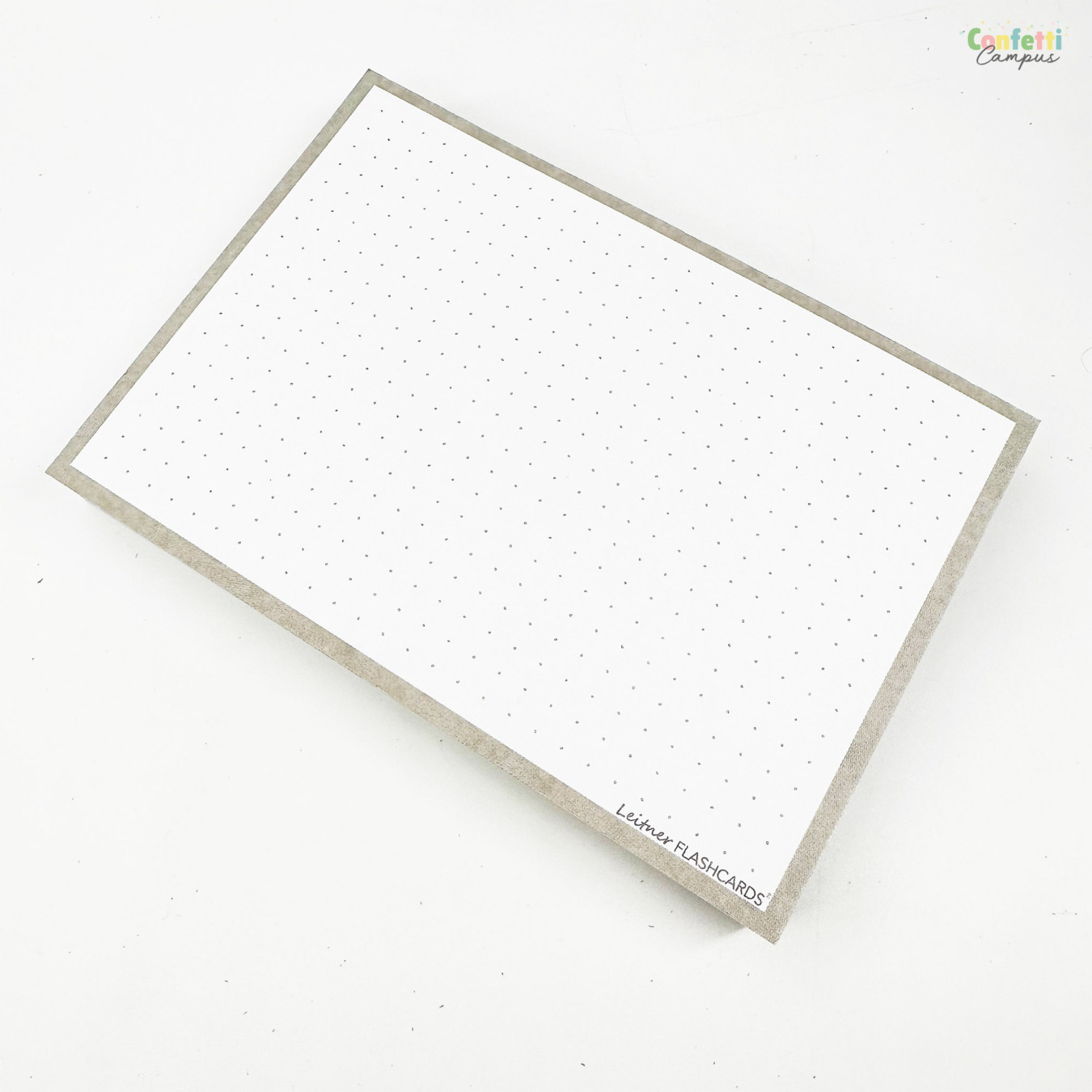 Leitner Flashcards® in A6 formaat (10 x 15 cm) met subtiele grijze rand en dotted patroon op 5 mm. Pakje van 50 stuks, samengebonden met een elastiekje.