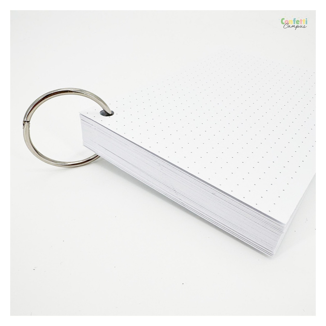Optioneel: De A6 dotted flashcards kunnen geperforeerd worden. Dan boren we een gaatje linksbovenin de kaarten. Combineer dit met een handige klikring en houd de kaarten eenvoudig bij elkaar. Bundel ze per onderwerp, examen of vak. Je kunt ze ook in je tas stoppen en de flashcards meenemen om onderweg te studeren.