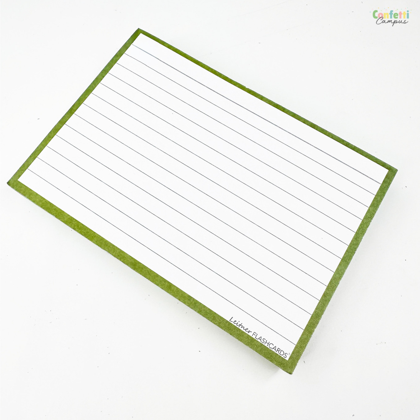 Leitner Flashcards® in A6 formaat (10 x 15 cm groot) met stijlvolle olijfgroene rand. Gelinieerd met titel lijn, pakje van 50 stuks.