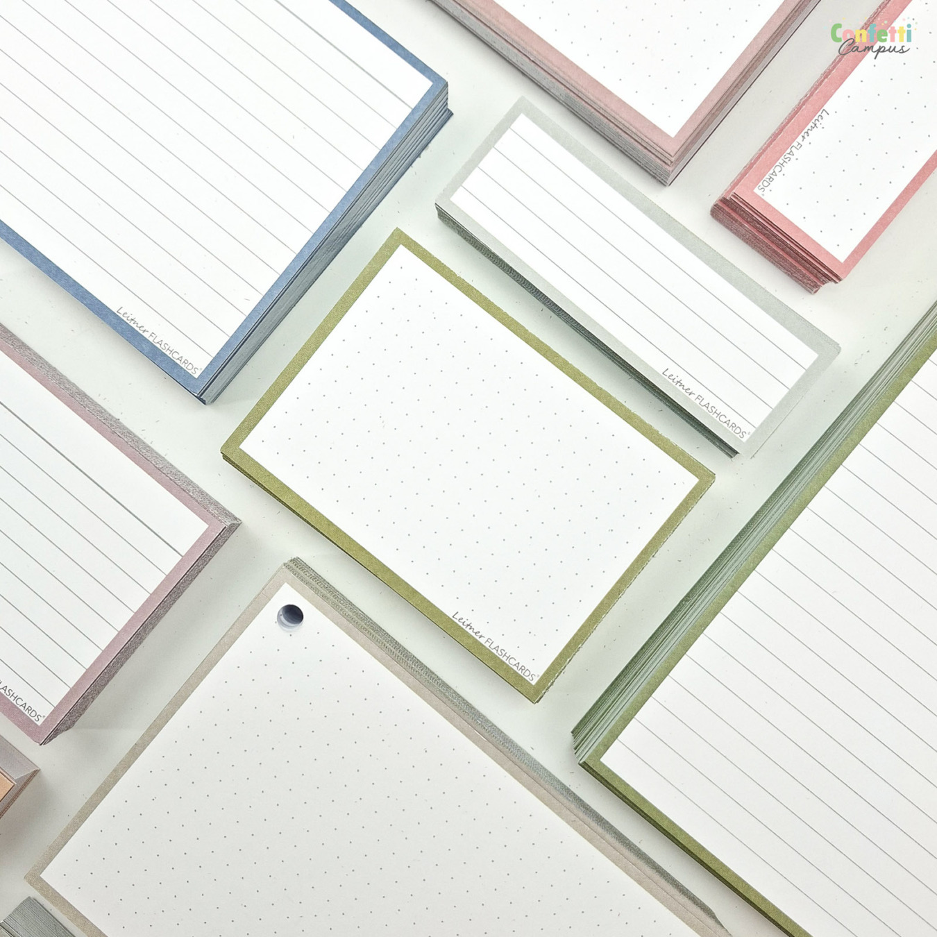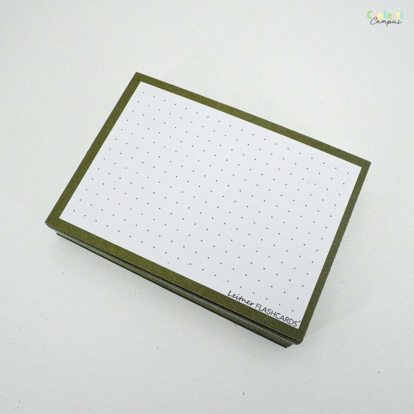 Leitner Flashcards® in A7 formaat, met een olijf groene rand. Dotted op 5 mm afstand, pakje van 50 stuks. Stijlvolle, diepgroene kleur uit de Leitner Nature collectie.