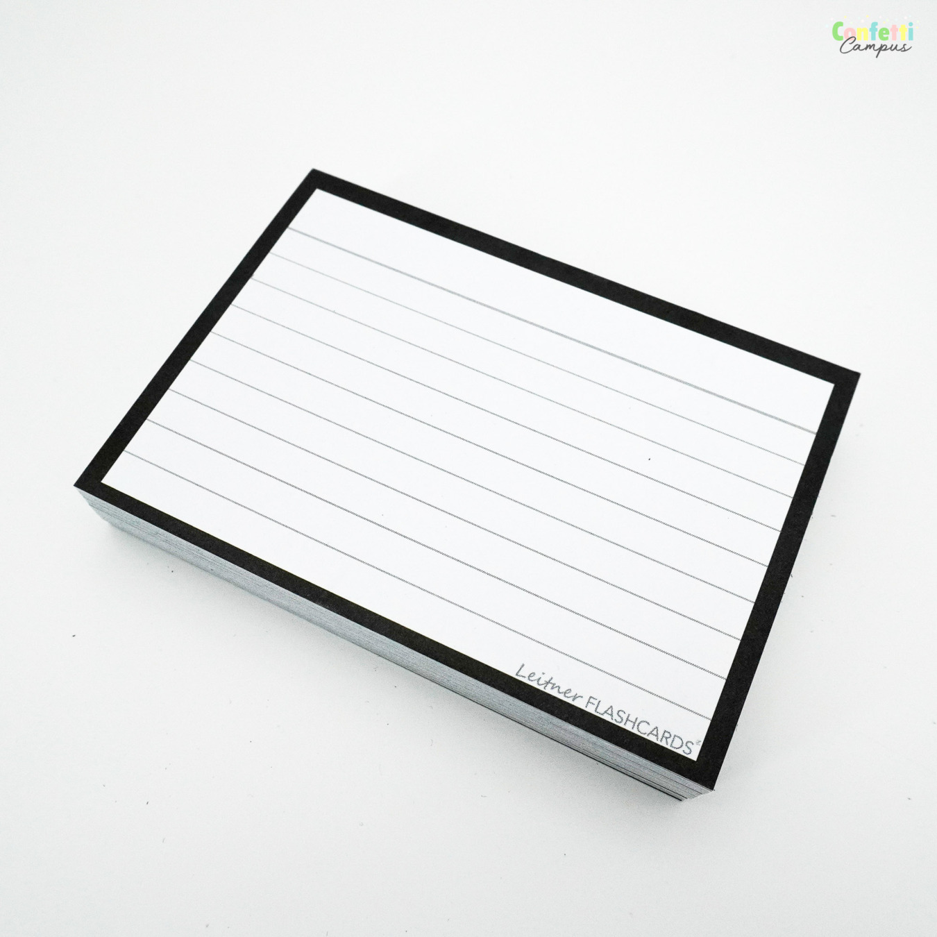 Zwarte Leitner Flashcards® in A7 formaat. De kaarten zijn gelinieerd en hebben een zwarte rand, zijn aan beide zijden gelijk. Gemaakt van dik, 300 grams papier en ideaal voor het leren van definities, gebruik als systeemkaarten of labels.