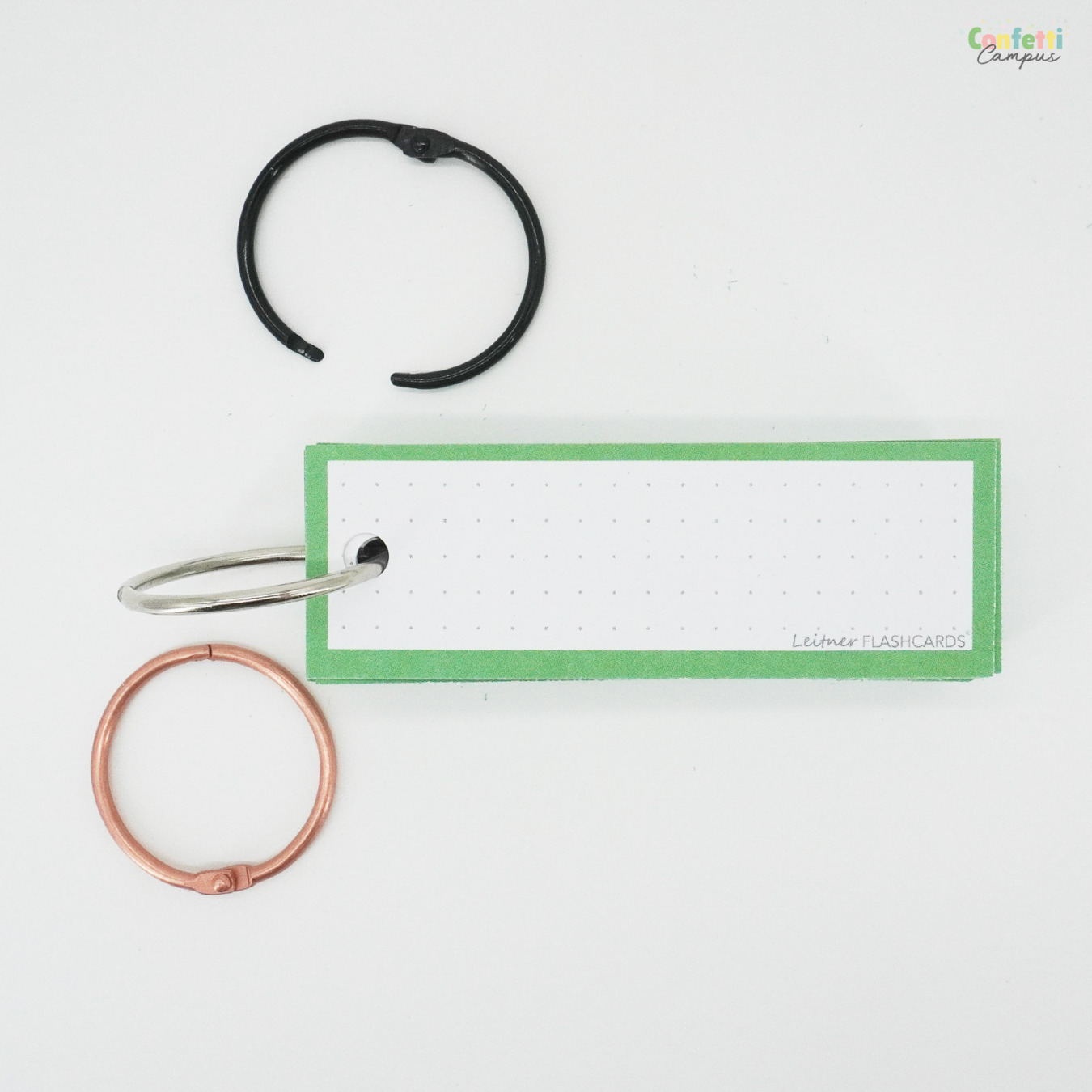 Optioneel: De halve dotted flashcards kunnen geperforeerd worden, dan boren we een gaatje aan de linkerkant van het pakje. Combineer dit met een handige klikring en je houdt zo de kaarten eenvoudig bij elkaar. Draai de kaarten stuk voor stuk door en leer sneller en leuker.