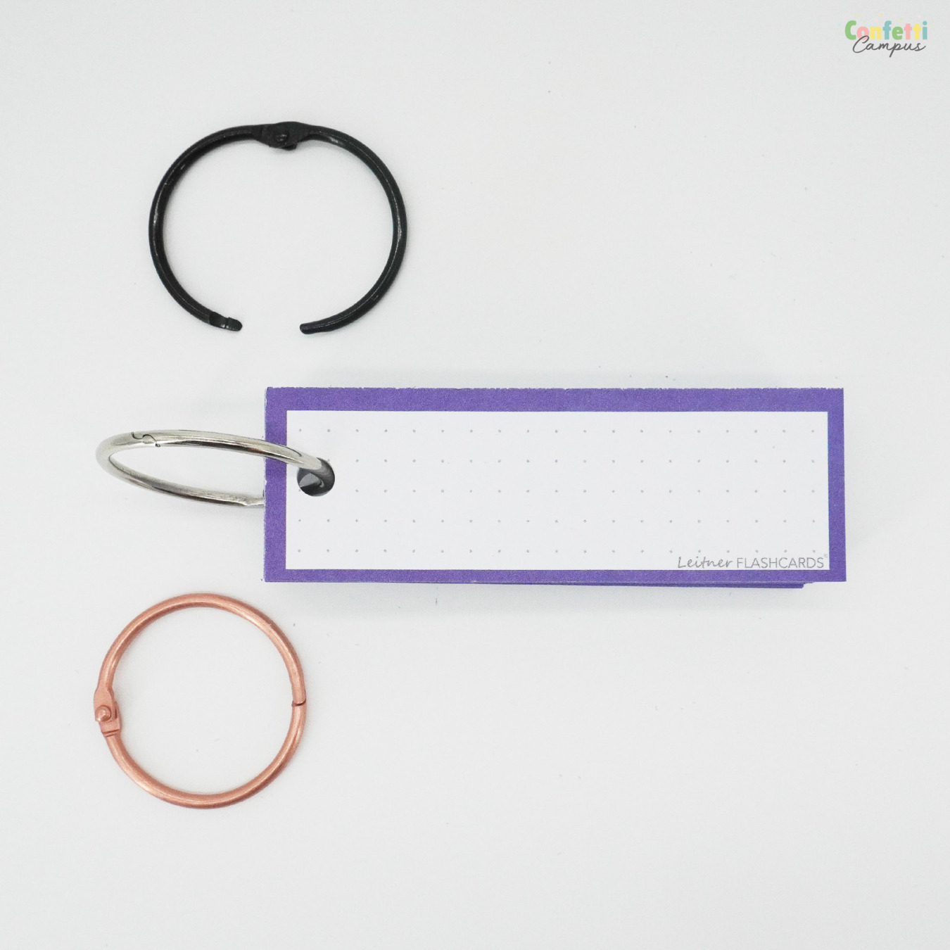 Optioneel: De halve dotted flashcards kunnen geperforeerd worden, dan boren we een gaatje aan de linkerkant van het pakje. Combineer dit met een handige klikring en je houdt zo de kaarten eenvoudig bij elkaar. Draai de kaarten stuk voor stuk door en leer sneller en leuker.