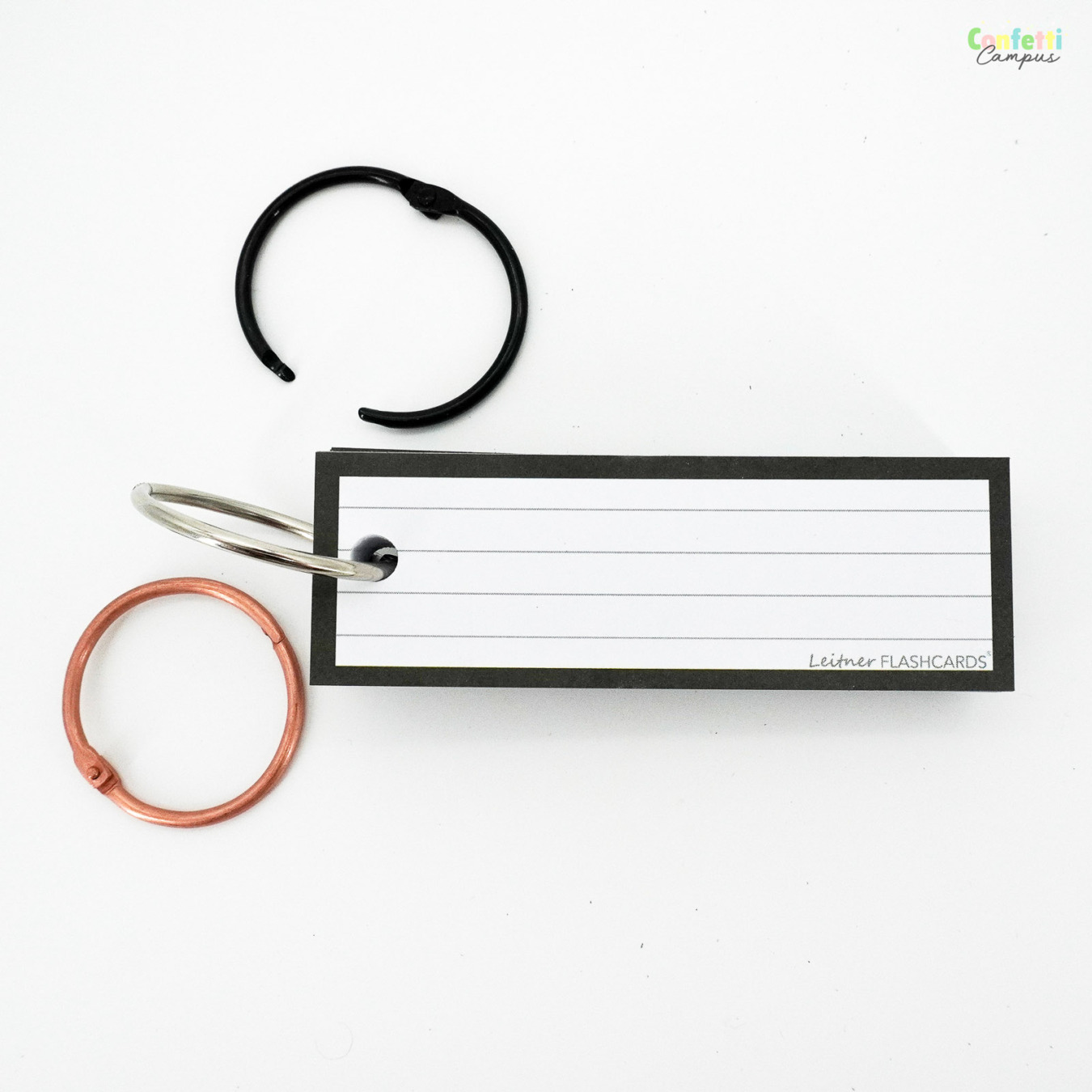 Dan boren we een gaatje aan de linkerkant van de flashcards. Combineer dit met een handige klikring en houd de kaarten eenvoudig bij elkaar. Dit is vooral handig met deze kleine woordkaarten.